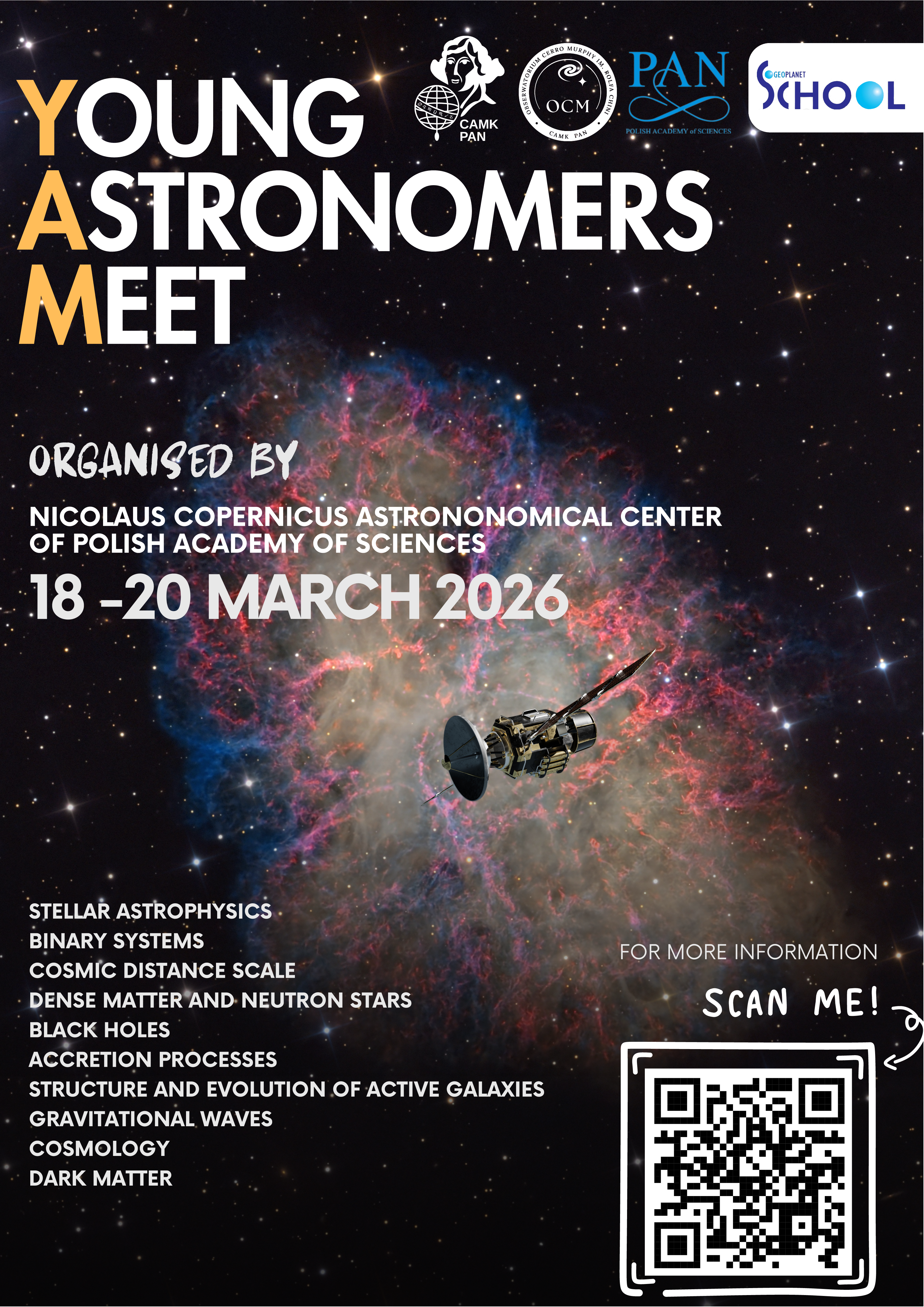 The Young Astronomers Meeting 2026 will be held in hybrid format (both on-site and on the Zoom platform) from March 18th 2026, to March 20th 2026, at the Nicolaus Copernicus Astronomical Center (CAMK PAN).